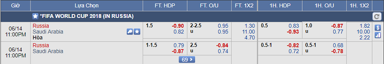 - Tỷ lệ cược chấp cả trận : Nga chấp Ả Rập Xê Út 1 1/2 trái cả trận, trên ăn đủ thua 9, dưới ăn 82.